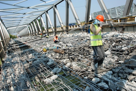 Pekerja menyelesaikan proses perbaikan jembatan Pantura yang menghubungkan Demak-Kudus di kawasan Jati, Kudus, Jateng, Senin (1/10). Perbaikan jembatan padat arus lalu lintas yang diperkirakan membutuhkan biaya hingga Rp.4 miliar tersebut guna kenyamanan, keselamatan pengguna jalan serta untuk menunjang roda perekonomian dan aktiftas lain masyarakat.