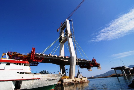 Sebuah kapal berada di sekitar Jembatan Soekarna yang dalam tahap pembangunan, di kota Manado, Sulawesi Utara, Rabu (5/9). Pembangunan jembatan tersebut yang menelan biaya APBN sebesar Rp 200 miliyar lebih ini diperikaran selesai pada Desember 2012.