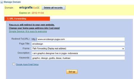 Dalam kasus ini saya mau memforward domain gratis saya di ericgrafis.co.cc ke web utama saya ericdesign-jogja.com