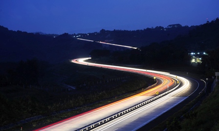 Kendaraan melintasi jalan tol ruas Semarang-Ungaran saat senja tiba. Selain memperlancar arus lalu-lintas, barang dan jasa, keberadaan jalan tol ini juga menawarkan keindahan alamnya.