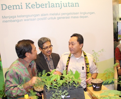 Direktur External Relations, PT Vale Indonesia Tbk, Kamba Basrie berbincang bersama Menteri Kehutanan, Zulkifli Hasan tentang program rehabilitasi lahan tambang di stand PT Vale pada pameran Indogreen, Expo 2013, yang berlangsung tanggal 4 – 7 April di Assembly Hall JCC. PT Vale telah membangun kebun pembibitan (nursery) yang menghasilkan 700.000 pohon per tahun dan merehabilitasi sekitar 110 hektar lahan setiap tahun. Demi menerapkan Good Mining Practice, PT Vale berkomitmen menjadi perusahaan tambang yang baik dan bertanggung jawab pada keberlangsungan ekosistem dan lingkungan.