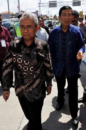 Menteri Pekerjaan Umum, Djoko Kirmanto (kiri) bersama Gubernur Bali, Made Mangku Pastika (kanan) meninjau "Underpass" Simpang Dewa Ruci, Badung, Bali, Kamis (15/8). Jalan bawah tanah sepanjang sekitar 400 m tersebut dibangun untuk mengatasi kemacetan lalu lintas yang selama ini menjadi persoalan serius menjelang berlangsungnya KTT APEC pada Oktober 2013.